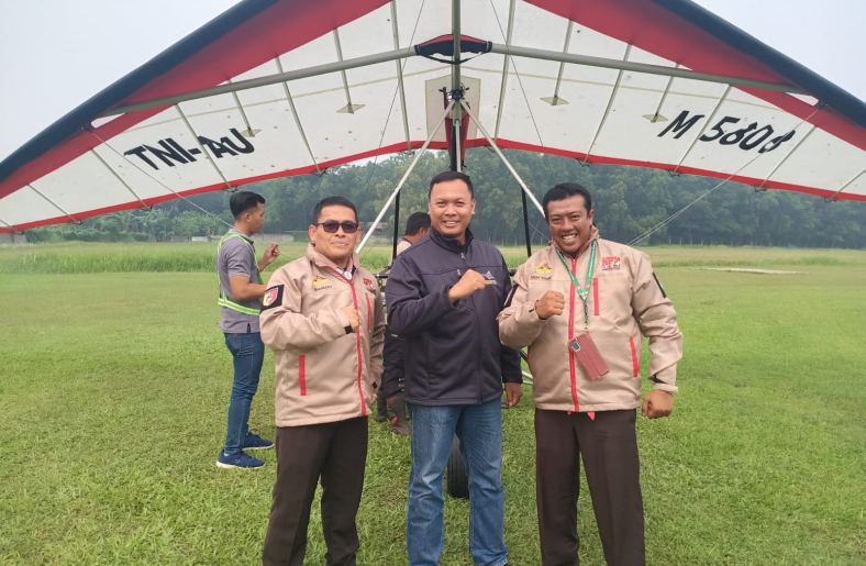 JAKARTA — Pimpinan Kontingen Cabang (Pinkoncab) Agam Kak Andry Kesuma dan anggota kontingen Karang Pamitran Nasional (KPN) tahun 2023, Kak Ridwan mencoba terbang bersama pesawat Trike di Lapangan Terbang Olahraga Dirgantara (Laptera), Jumat (07/07/2023) di Cibubur.